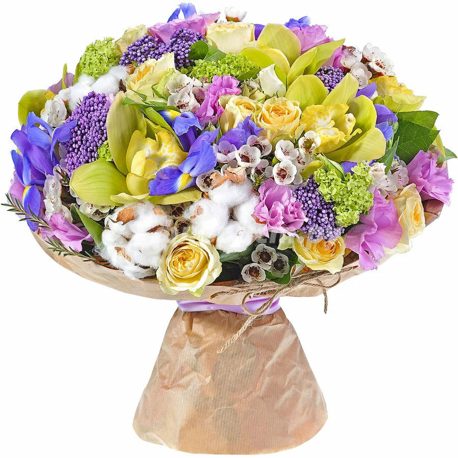 Озотамнус, орхидея желтая, ваксфлауэр, ирис синий, роза кустовая желтая, эустома сиреневая, гортензия зеленая, салал, хлопок. Упаковка (лента, пленка, крафт, сетка, пленка матовая)
