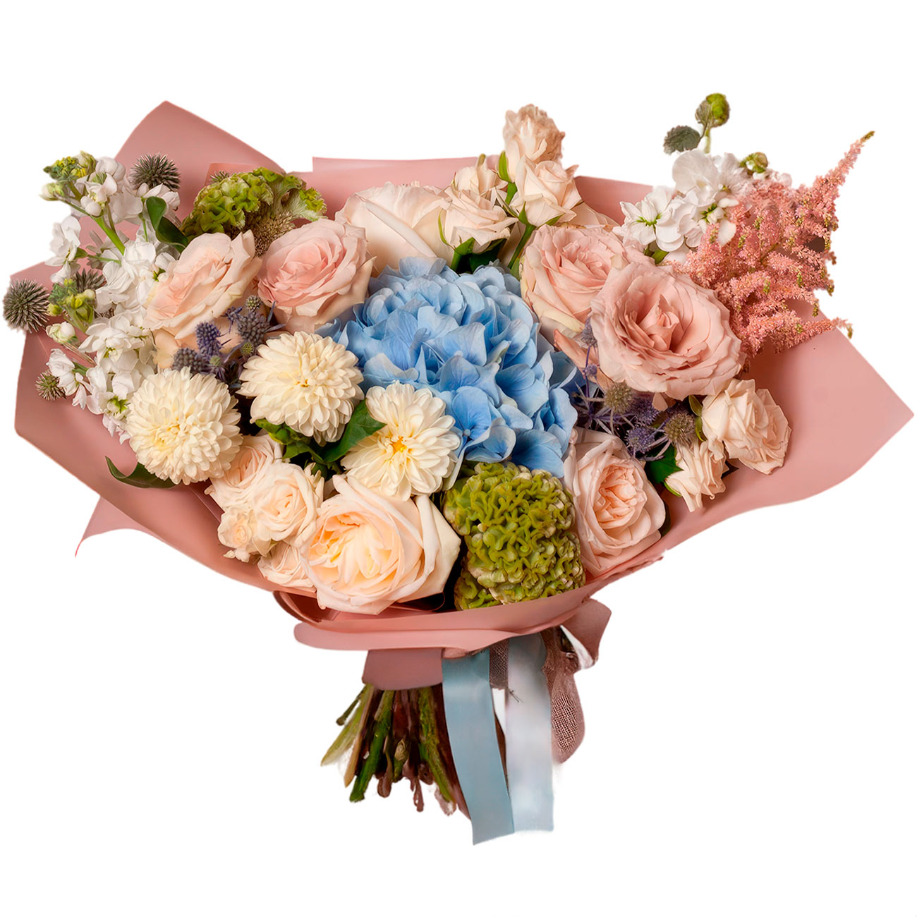 Георгина кремовая, гортензия голубая, роза одноголовая кремовая, астильба, роза кустовая кремовая, маттиола белая, декоративная зелень. Упаковка (лента, пленка, крафт, сетка, пленка матовая)