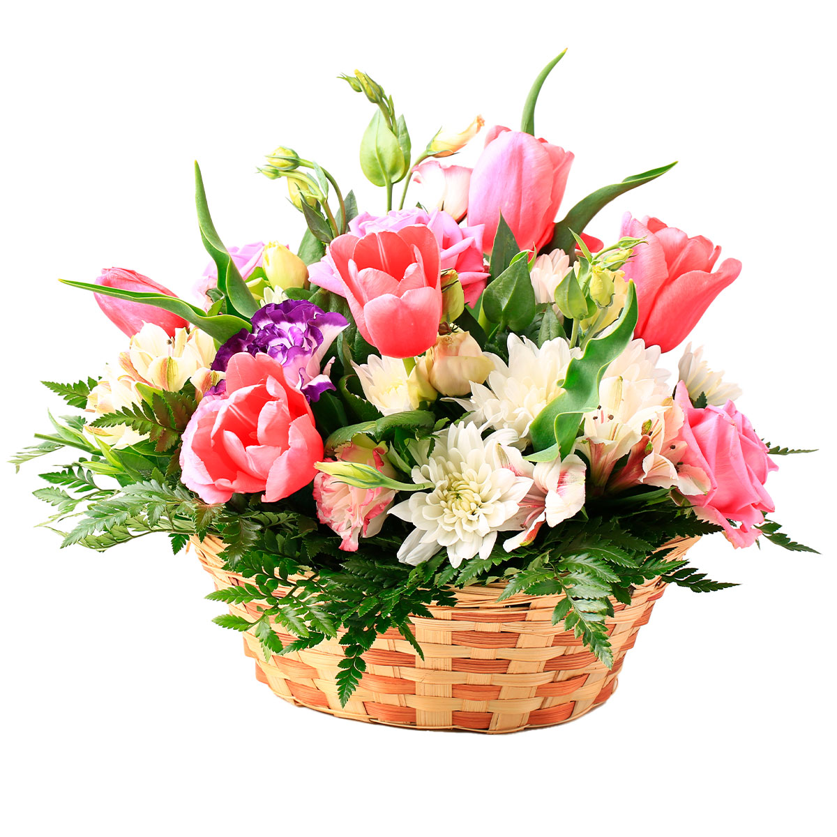 Тюльпан розовый, хризантема кустовая белая, альстромерия белая, гвоздика фиолетовая, зелень. Упаковка (Корзина, оазис, ящик).